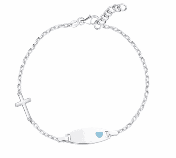 Детска сребърна гривна с кръстче и гравирана плочка Синьо сърце