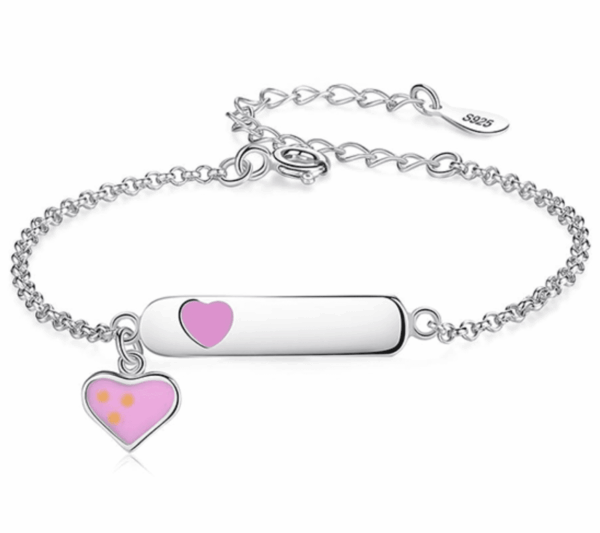Детска сребърна гривна с плочка за гравиране и висулка сърце