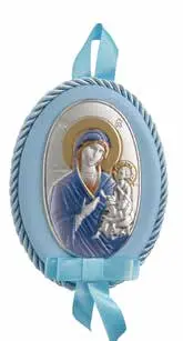 Тази детска икона за момче изобразява Дева Мария, прегърнала Младенеца – силен символ на любов, защита и духовна подкрепа. Иконата е в синя кожена рамка – подходяща за момченце – и е изработена с високо качество и стил. Подходяща за поставяне в детската стая – до кошара, на рафт или в иконостас. Комбинира религиозно значение с модерен и елегантен дизайн.