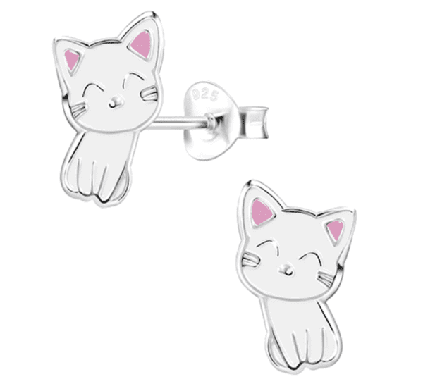 Очарователни детски сребърни обеци с бели котенца, изработени от сребро 925. Хипоалергенно и удобно винтово закопчаване за деца над 3 години. Перфектен подарък за момиче.