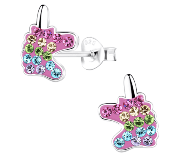 Детски сребърни обеци Блестящ розов еднорог, тип винт – Магия, нежност и безопасен комфорт