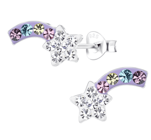 Изящни детски сребърни обеци Блестяща падаща звезда, изработени от сребро 925 с надеждно винтово закопчаване. Хипоалергенни и удобни, създадени за нежните детски уши. Със своя блясък и небесен дизайн, тези обеци носят магия и радост във всяко детско ежедневие.