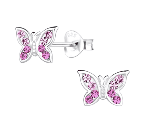 Детски сребърни обеци Блестяща розова пеперуда, тип винт – магия и безопасност за всяко детско ухо