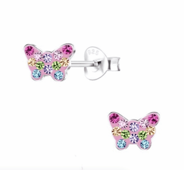 Детски сребърни обеци Пеперуди, тип винт – блестящи, цветни и безопасни