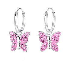 Детски сребърни обеци Блестящи розови пеперуди, тип халка
