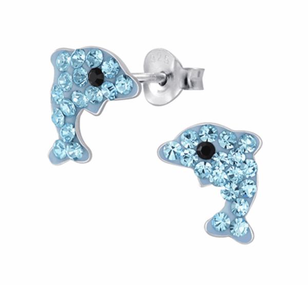 Детски сребърни обеци Блестящи сини делфини, тип винт