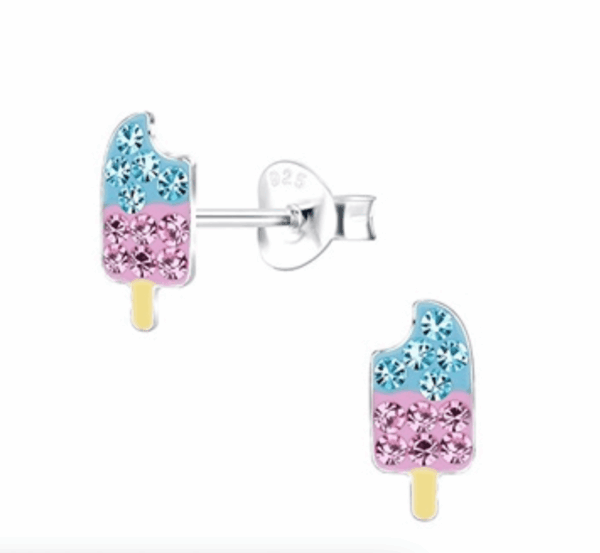 Очарователни детски сребърни обеци Блестящи сладоледи от сребро 925 с надеждно закопчаване тип винт. Хипоалергенни и удобни, съчетават забавен дизайн с комфорт за ежедневно носене и специални моменти.