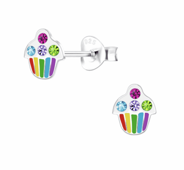 Детски сребърни обеци Кексче, тип винт – блестящи цветове и сладка визия