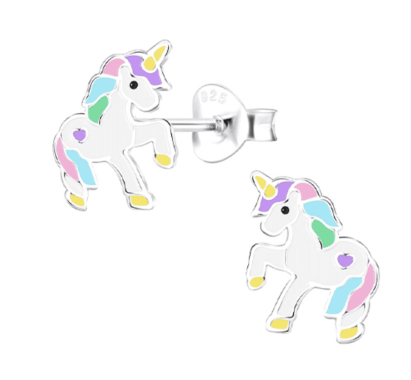 Очарователни детски сребърни обеци Еднорог от сребро 925 с надеждно закопчаване тип винт. Хипоалергенни и удобни, създадени да носят радост, стил и малко приказна магия всеки ден.