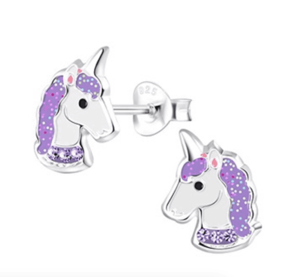 Детски сребърни обеци Лилав еднорог, тип винт – магия, безопасност и стил