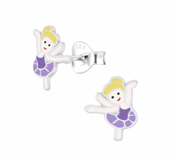 Очарователни детски сребърни обеци Лилава балерина от сребро 925 с надеждно закопчаване тип винт. Хипоалергенни и удобни, с изящен и игрив дизайн, създадени да носят усмивки и комфорт всеки ден.