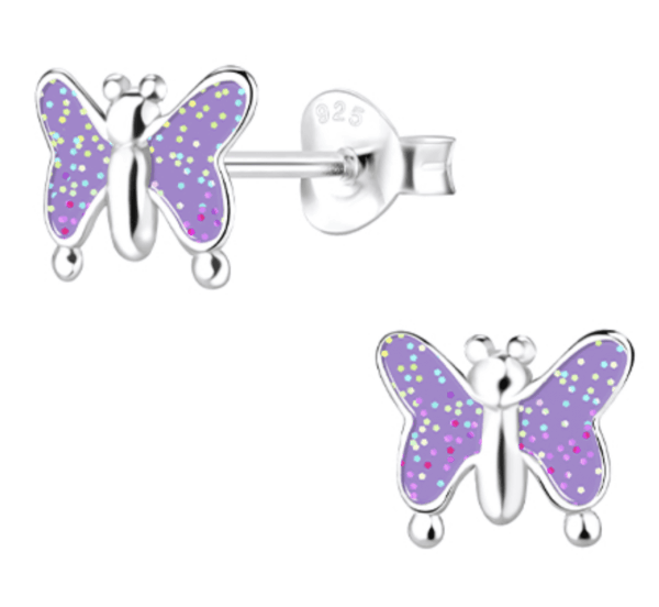 Детски сребърни обеци Лилава пеперуда, тип винт
