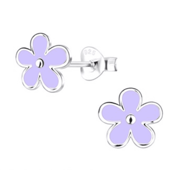 Нежни детски сребърни обеци Лилаво цвете от сребро 925 с надеждно закопчаване тип винт. Хипоалергенни и удобни, подходящи за ежедневно носене и специални поводи, съчетавайки стил и комфорт.