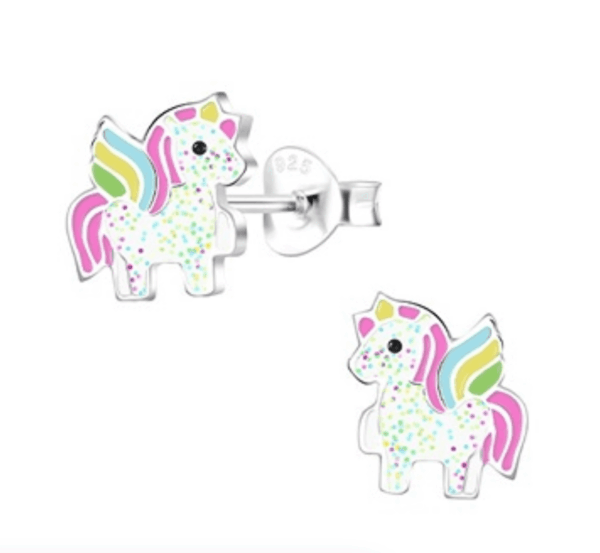 Детски сребърни обеци Приказен еднорог, тип винт
