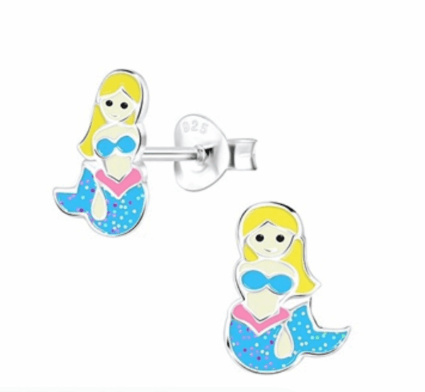 Детски сребърни обеци Приказна синя русалка, тип винт – магия и сигурност за малките дами