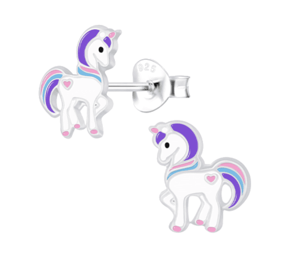 Детски сребърни обеци Щастлив лилав еднорог, тип винт