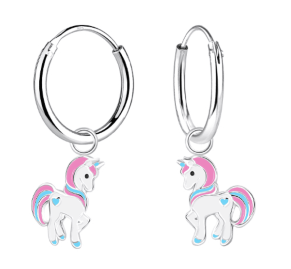Детски сребърни обеци Щастлив розов еднорог, тип халка – магия за всяко дете