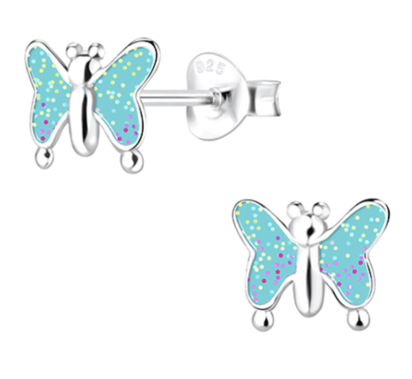 Детски сребърни обеци Синя пеперуда, тип винт