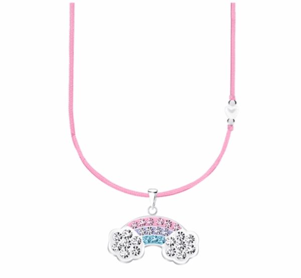 Детско сребърно колие с розов конец и бяло мънисто с висулка Блестяща дъга
