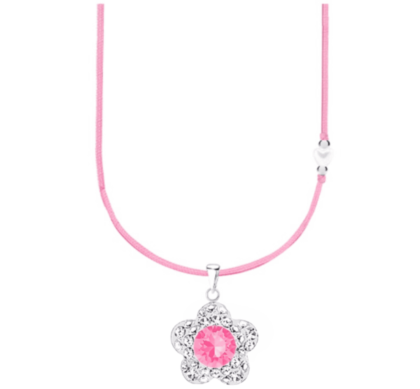 Това нежно и изящно детско сребърно колие е перфектният аксесоар за всяко малко момиче, което обича блясъка и финеса. Изработено е от висококачествено стерлингово сребро проба 925, съчетано с мек и здрав розов конец, който придава допълнителна нежност и комфорт при носене. Основният акцент на колието е красиво розово кристално цвете – висулка, която блести и привлича вниманието.
