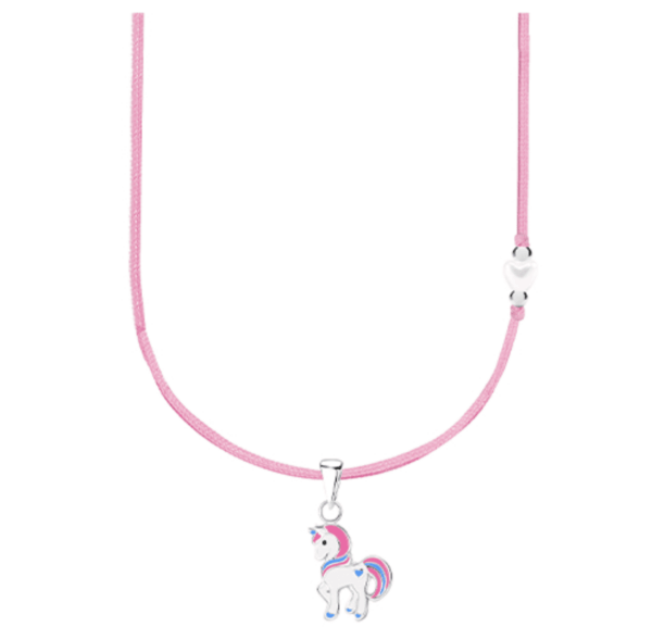 Детско сребърно колие с розов конец и бяло мънисто с висулка Щастлив еднорог – стилен и безопасен аксесоар за малки мечтатели