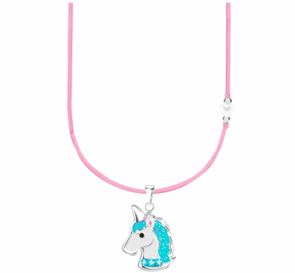 Детско сребърно колие с розов конец и бяло мънисто с висулка Син еднорог – магическо и стилно бижу