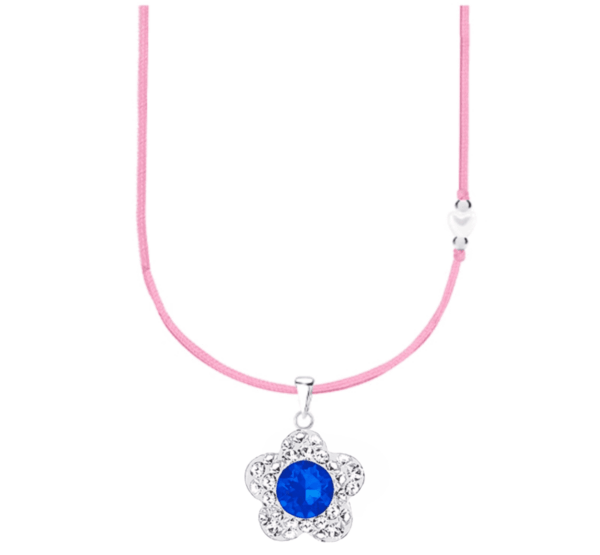Впечатляващото синьо кристално цвете в съчетание с изискания розов конец и бялото мънисто придават на това колие една неповторима елегантност и изтънченост. Изработено от хипоалергенно сребро, то е безопасно за деликатната детска кожа.