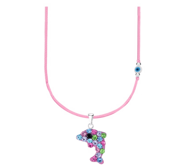 Детско сребърно колие с розов конец и синьо мънисто с висулка Блестящ шарен делфин – забавно и стилно бижу за малки любители на морето