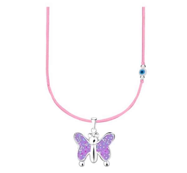 Детско сребърно колие с розов конец и синьо мънисто с висулка Лилава пеперуда