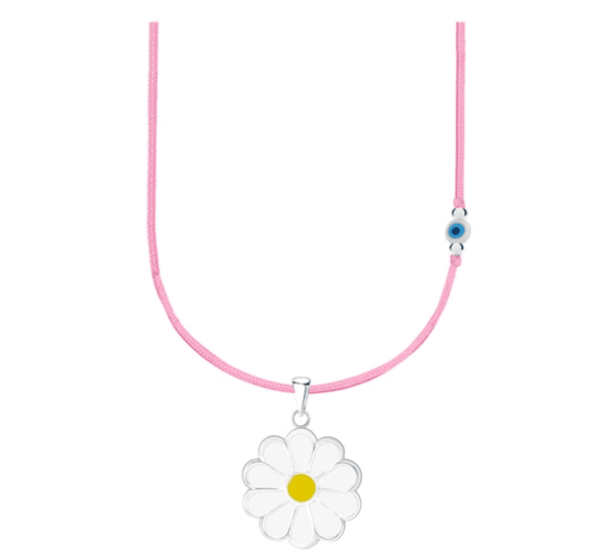 Детско сребърно колие с розов конец и синьо мънисто с висулка Маргаритка – свежо и красиво бижу за момиче