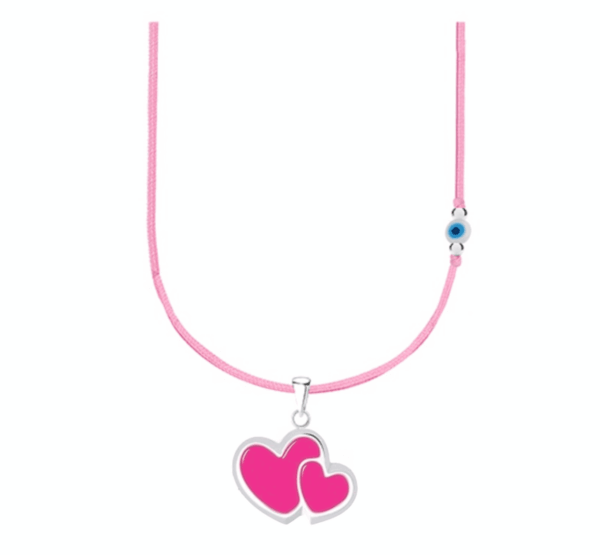 Детско сребърно колие с розов конец и синьо мънисто с висулка Сърца – стил и обич в едно