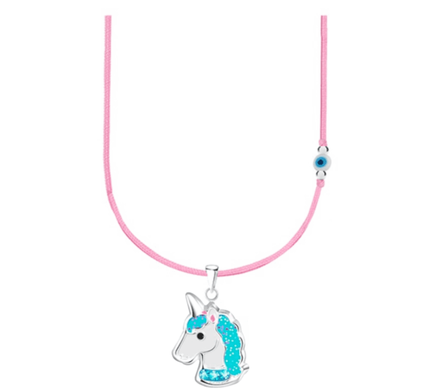 Съчетавайки розовия конец и синьото мънисто с висулка във формата на еднорог, то представлява истинска доза вълшебство и стил. Това нежно и елегантно колие е перфектното допълнение към всяка детска визия.