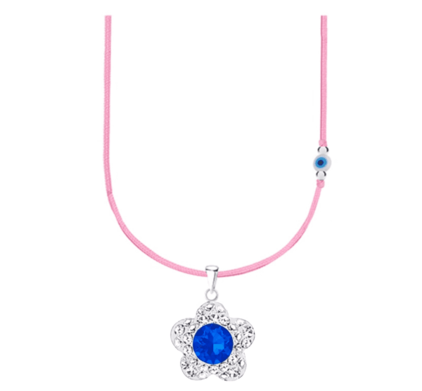 Детско сребърно колие с розов конец и синьо мънисто с висулка Синьо кристално цвете – сребро проба 925