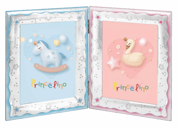 Детска двойна рамка за снимки изработена от метална сплав, която съдържа сребро по метода на тънкослойно покритие.