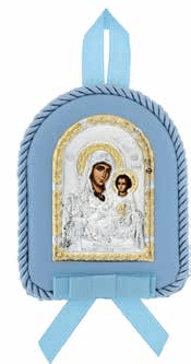 Детска икона Богородица с Младенеца, върху синя подложка,със златни елементи, изработена от метална сплав, която съдържа сребро по метода на тънкослойно покритие.