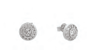 Дамски сребърни обеци с кръгла форма и голям кръгъл безцветен циркон в средата, монтиран с четири видими държача. Кръглият камък е ограден с един ред малки прозрачни камъчета.Закопчване с винт за удобно и сигурно носене,