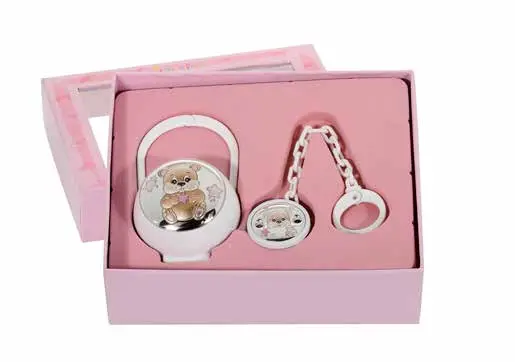 Нежен подаръчен комплект с кутия и държач за биберон в бяло, с посребрен елемент с розово мече. Подходящ за новородено момиче – красив и функционален подарък.