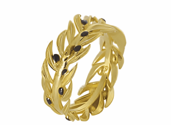 Формата на две изящни маслинови клонки образува символ на корона, което представлява изобилието и благополучието. Пръстенът е изключително изискан и подчертава вашия стил със своята елегантност. Златните елементи добавят луксозен блясък и изисканост към бижуто.
