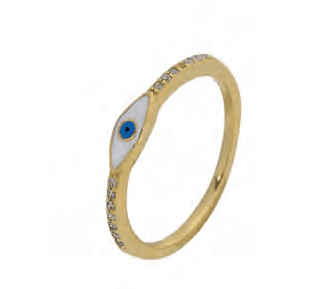 Позлатен сребърен пръстен с бял емайл и цирконии „Окото на Назар“,светлосиньо