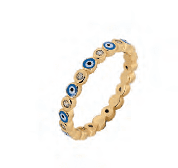 Сребърен пръстен с позлата от жълто злато и с интересни елементи във формата на синьо око, за което се предполага, че пази от лоши мисли и носи късмет. ППрез едно са разположени и малки кръгове, изработени от кубичен цирконий.