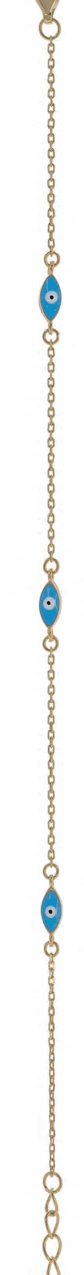 Открийте изяществото на сребърната гривна с позлата, украсена с три светлосини оченца. Тази елегантна гривна съчетава класическия символ на защита – „Окото на Назар“, с луксозния блясък на позлатата и нежен светлосин цвят. Изработена от висококачествено сребро с позлата, този аксесоар е идеален за всеки повод, добавяйки нотка на стил и защита към вашата визия