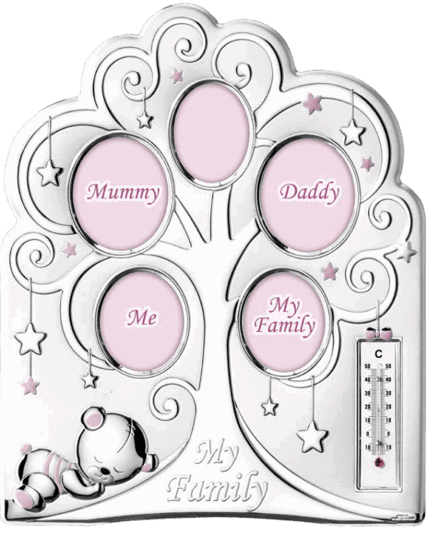 Семейна колажна сребърна рамка под формата на родословно дърво в розов цвят, стаен термометър и размери 25х30см