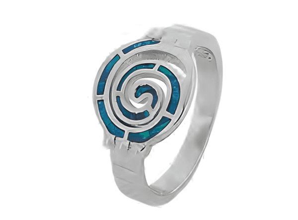 Изработен от висококачествено сребро, пръстенът представлява уникален дизайн със спираловидна форма, която придава на бижуто изключителна изящност. Опалът в центъра на пръстена допринася за играта на цветове и интригува със своята красота.