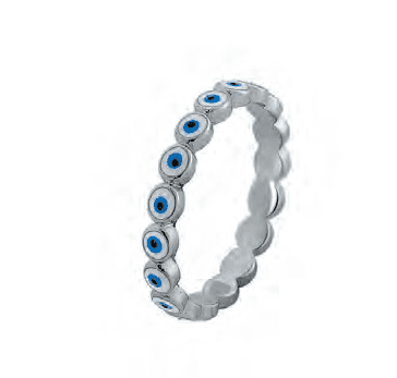 Този изящен сребърен пръстен е истинско произведение на изкуството, съчетаващо в себе си елегантност, финес, свежест и защита. Основата от бял емайл придава на пръстена лекота и нежност, а сините очички, инкрустирани в нея, са не само красиви, но и символизират късмет, благополучие и успех. Светлосиният цвят на очичките е свеж и спокоен, а елегантният дизайн на пръстена го прави подходящ за всякакъв повод.
