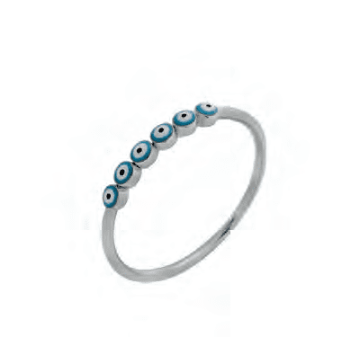 Този изящен сребърен пръстен е истинско произведение на изкуството, съчетаващо в себе си елегантност, нежност и защита. Шестте сини очички, инкрустирани в елегантен сребърен обков, не само са красиви, но и символизират късмет, благополучие и успех. Светлосиният цвят на очичките придава на пръстена нежност, свежест и красота