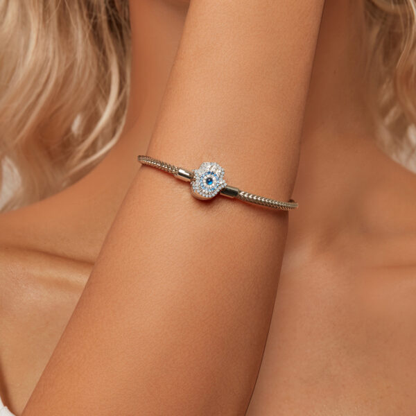 Елегантна сребърна гривна тип Пандора с Ръката на Фатима – съчетава стил и защита. Перфектен подарък за всяка жена.