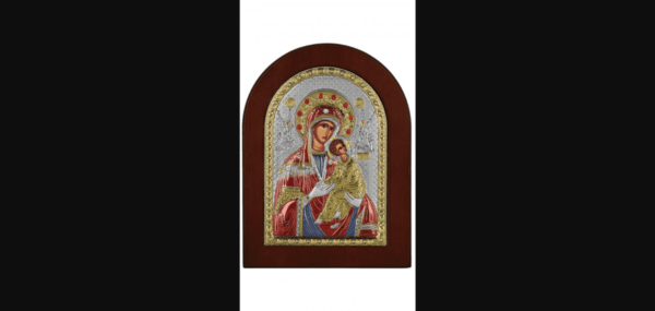 Точно копие на византийска сребърна икона с изображение на Дева Мария.Изработена от метална сплав, която съдържа сребро по метода на тънкослойно покритие и частично позлатена със злато.Среброто е специално обработено, за да запази блясъка си и да остане непроменено във времето. Ликът на Дева Мария и Христос има цветове на агиография, отпечатани върху платно. Иконата е представена в кафяво дърво с дървена стойка и вложка за окачване на стената. Предлага се като подарък за сватба, кръщене или имен ден. Вечен подарък, който никога не губи своята стойност.
