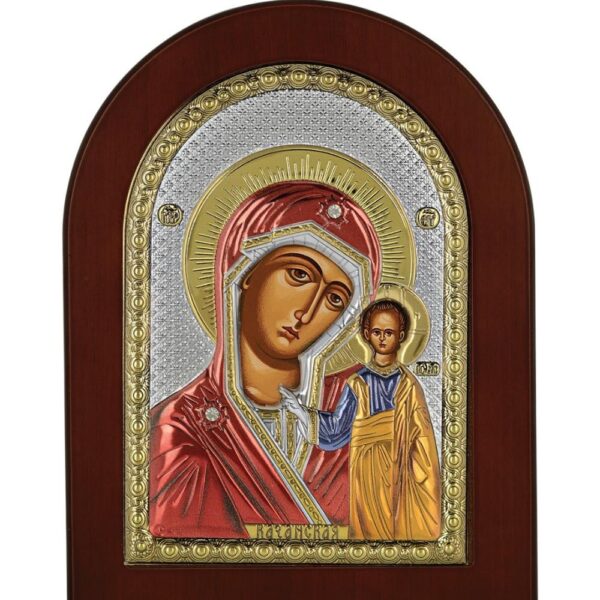 Сребърна икона на Казанска Богородица, изработена от дърво,метална сплав, която съдържа сребро по метода на тънкослойно покритие и позлата.