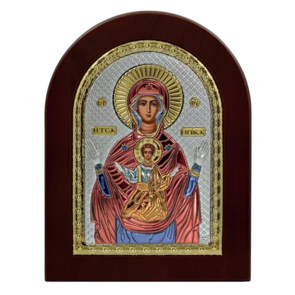 Прелестна икона на Божията Майка. Иконата е поставена в красив иконостас и положена на дървена подложка. Изработено от метална сплав, която съдържа сребро по метода на тънкослойно покритие.