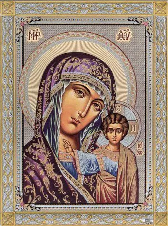 Ръчно рисувана икона на Казанската Света Богородица. Красиво изображение на Божията Майка с малкия Иисус Христос в стилна сребърна рамка и елегантна сребърна и позлатена декорация. Подходящ избор за подарък.